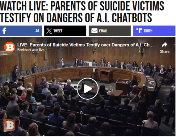 Watch Live: Parents of Suicide Victims Testify on Dangers of A.I. Chatbots www.breitbart.com/tech/2025/09/16/watch-live-parents-of-suicide-victims-testify-on-dangers-of-a-i-chatbots/ Sent from my Galaxy