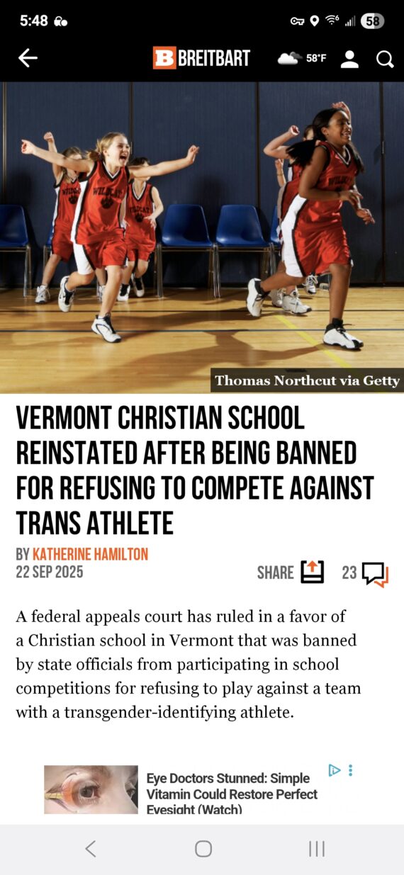 Vermont Christian School Reinstated After Being Banned for Refusing to Compete Against Trans Athletewww.breitbart.com/politics/2025/09/22/vermont-christian-school-reinstated-after-being-banned-refusing-compete-trans-athlete/ Sent from my Galaxy