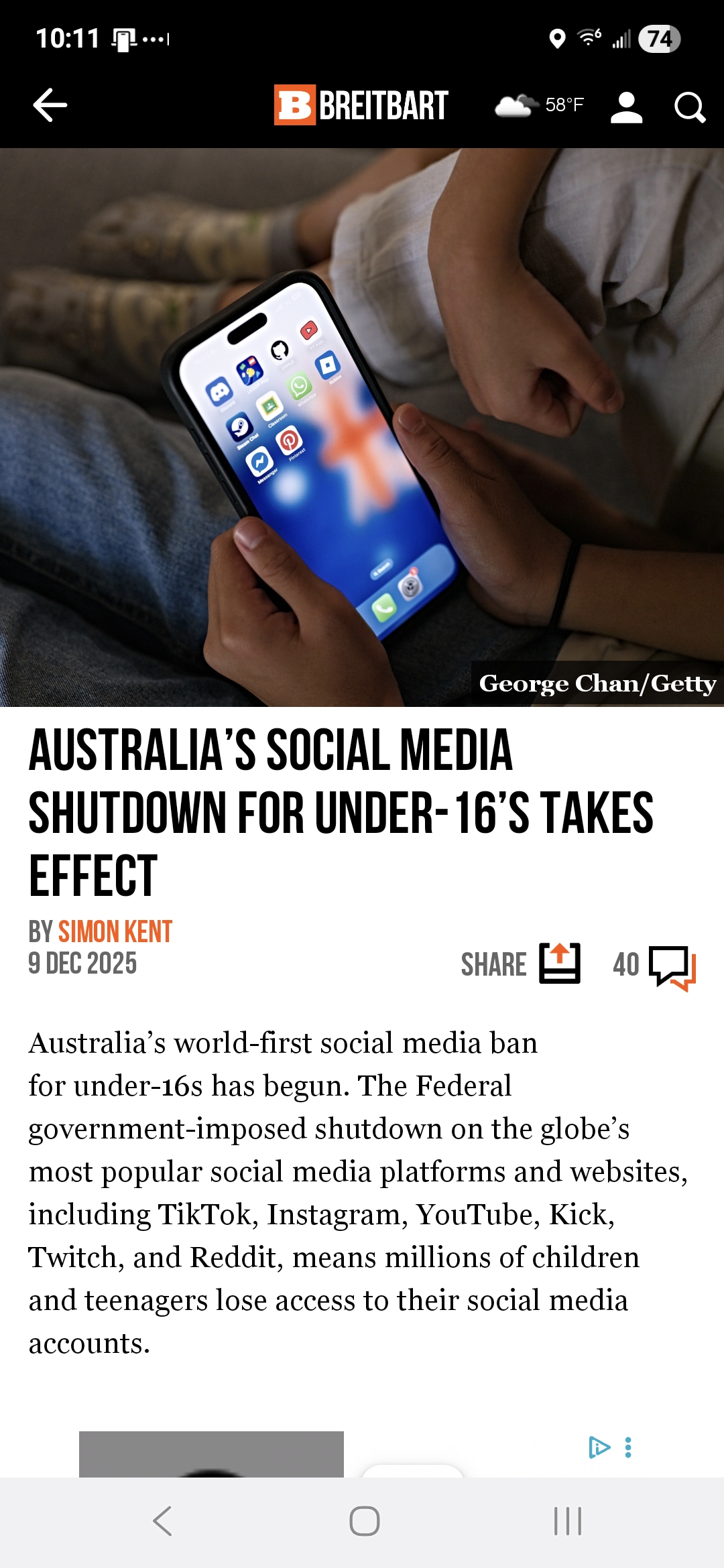 Australia’s Social Media Shutdown for Under-16’s Takes Effectwww.breitbart.com/tech/2025/12/09/australias-social-media-shutdown-for-under-16s-takes-effect/ Sent from my Galaxy