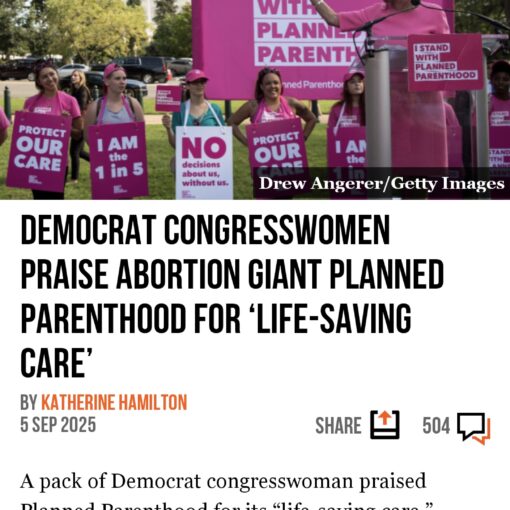 Democrat Congresswomen Praise Abortion Giant Planned Parenthood for ‘Life-Saving Care’www.breitbart.com/politics/2025/09/05/democrat-congresswomen-praise-abortion-giant-planned-parenthood-for-life-saving-care/ Sent from my Galaxy