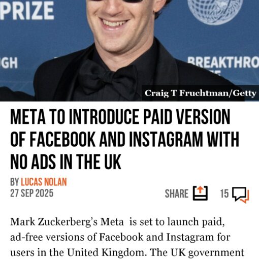 Meta to Introduce Paid Version of Facebook and Instagram with No Ads in the UK www.breitbart.com/tech/2025/09/27/meta-to-introduce-paid-version-of-facebook-and-instagram-with-no-ads-in-uk/ Sent from my Galaxy