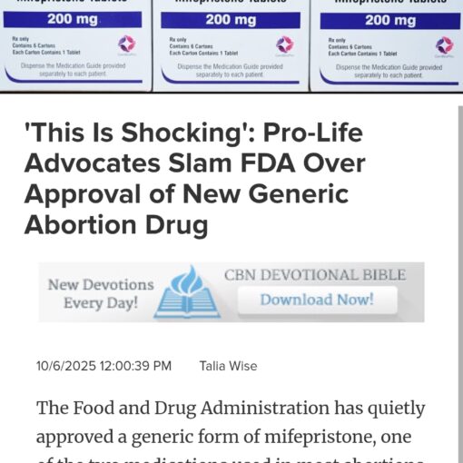 www1.cbn.com/cbnnews/health/2025/october/this-is-shocking-pro-life-advocates-slam-fda-over-approval-of-new-generic-abortion-drug Sent from my Galaxy