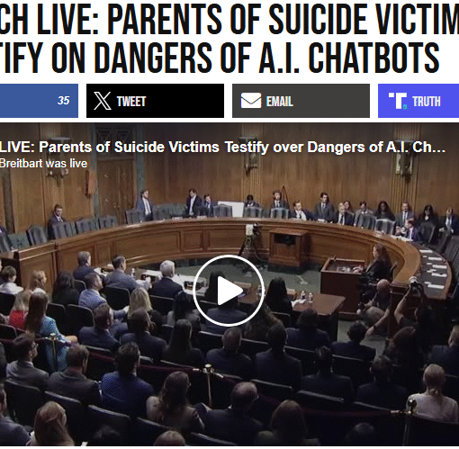 Watch Live: Parents of Suicide Victims Testify on Dangers of A.I. Chatbots www.breitbart.com/tech/2025/09/16/watch-live-parents-of-suicide-victims-testify-on-dangers-of-a-i-chatbots/ Sent from my Galaxy